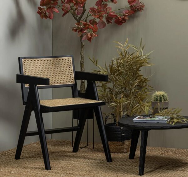 Eetkamerstoel Gunn brengt sfeer in je eethoek! Het zit- en ruggedeelte is vervaardigd uit rattan en wordt gedragen door een stoer, houten frame. Hierdoor heeft de stoel een landelijke, warme uitstraling. Gunn eetkamerstoel is naast getoonde versie ook verkrijgbaar in naturel, licht blond hout, die ook gemakkelijk te combineren zijn met elkaar. Materiaal pinewood en rattan.
